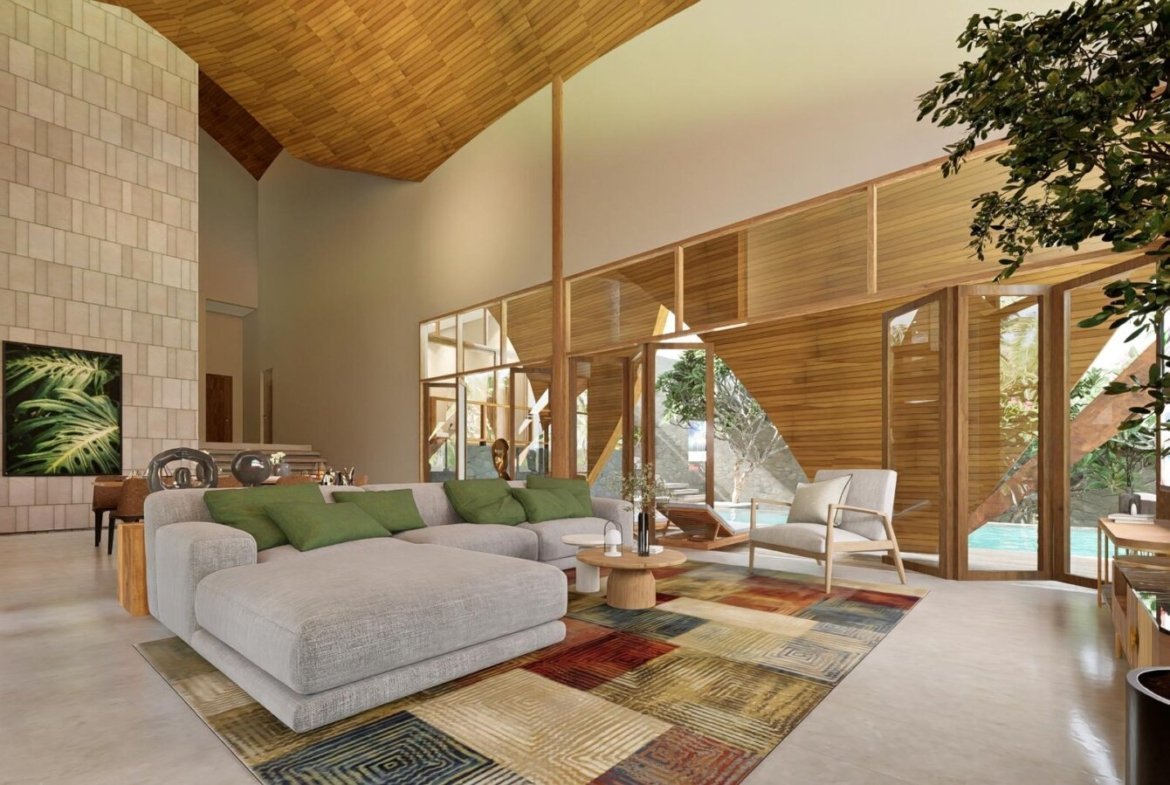 The villas are capped with the architect’s signature moon shadow roof that gives not only a high volume to the space but also adds a charming aesthetic as well as practical energy saving and water color benefits .