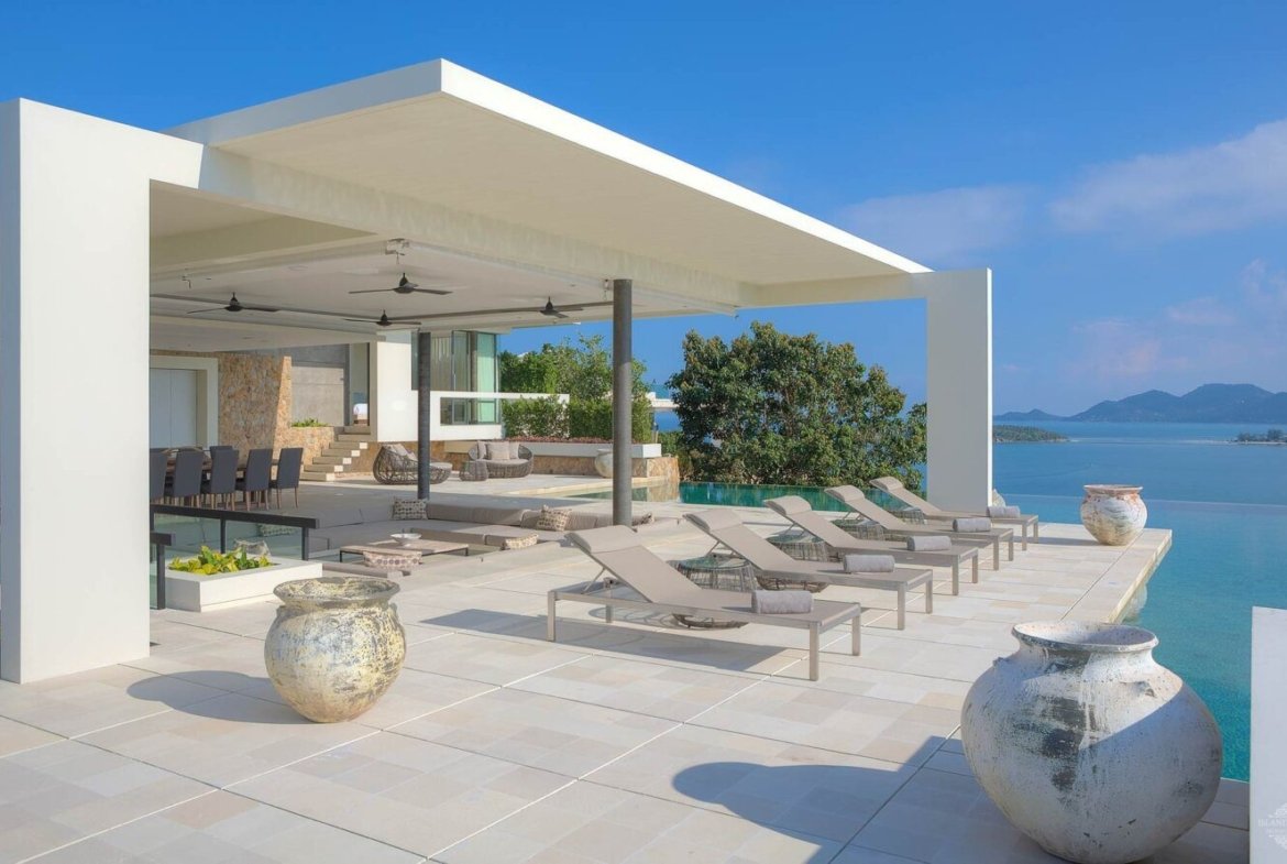 Villa 26 is perfectly placed to enjoy various views from the south and west, with scenes of the nearby islands as well as breathtaking sunsets. Offering five large bedrooms and eight bathrooms, the villa also houses a large garden, private gym, and in-villa cinema. A holiday dream, Villa 26 also has two modern fully equipped kitchens designed with entertainment in mind. The infinity edge pool is long enough to swim laps and the garden area is also great for family fun during your stay.