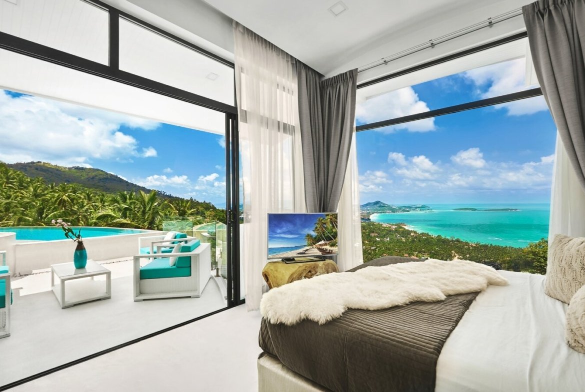 This unique infinity pool villa is perched on the prestigious peak of the Chaweng Noi hillside, with spectacular panoramic sea-views across the Chaweng Bay, Koh Phangan and surrounding islands. Featuring ultra-modern architecture, stylish design and a spectacular infinity-edge sea-view swimming pool, with circular soaking Jacuzzi tub. Stepping-stones lined with relaxing water features, lead the way to the spacious villa interior, with tranquil turquoise tones, creating a soothing contemporary living environment.